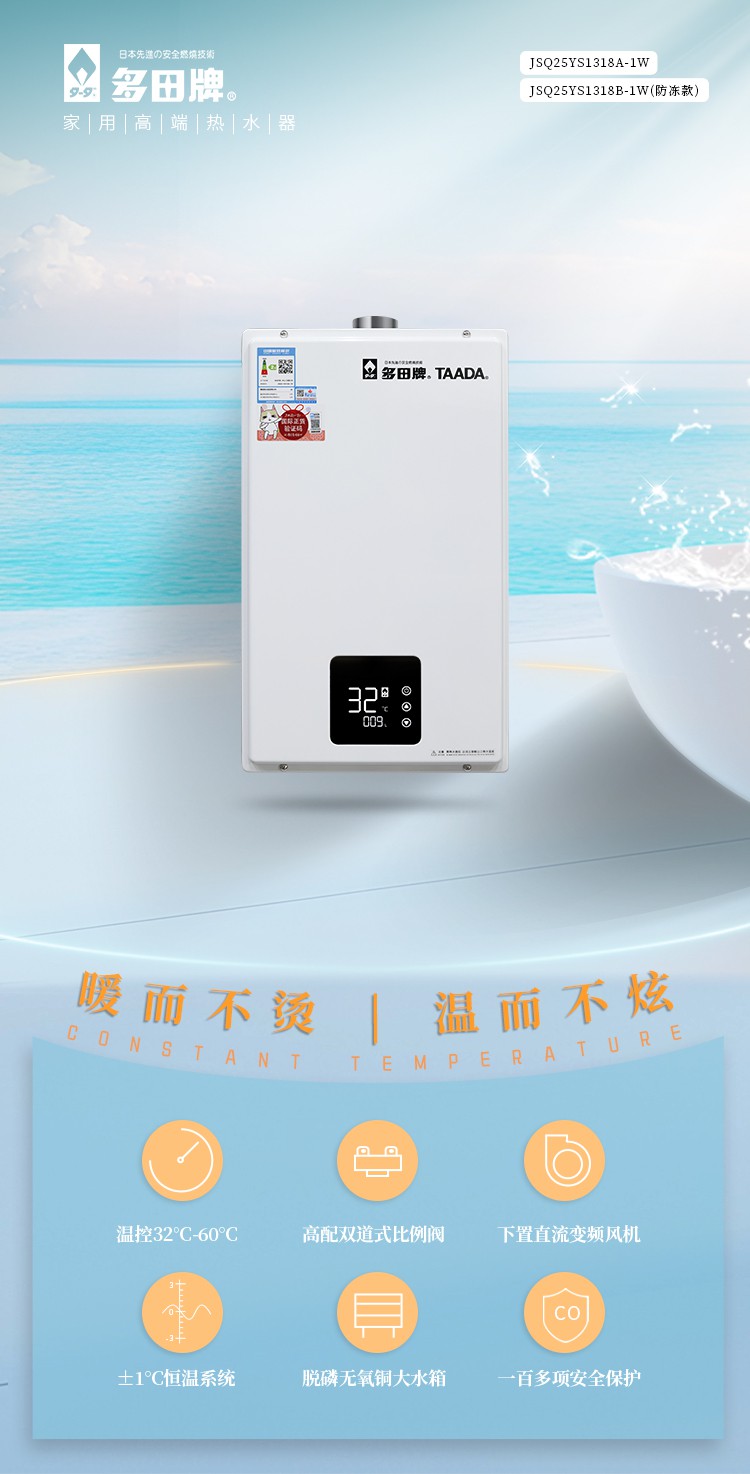 1982年,多田把第一台安全燃气热水器带进中国;今天,它用全新1318系列,再次刷新“舒适”二字的上限。TAADA JSQ25YS1318A-1W / 1318B-1W(防冻款)正式开售,一台机,把冬天暖而不烫、夏天温而不燥的幻想变成日常。